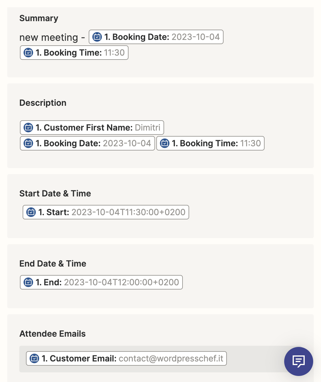 New meeting with [ customer First Name ] [ customer Last Name ] on [Booking Date] at [ Booking Time ].