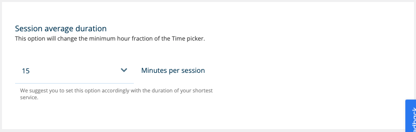 This option must be set thinking about the desired hourly fraction for the purpose of choosing the slot by the customers during the booking phase. The suggestion is to think of the service with the shortest duration and select the hourly fraction closest to this duration. Example: if the shortest of the services offered lasts 15 minutes. We will then use this interval to set the “average session duration” option.