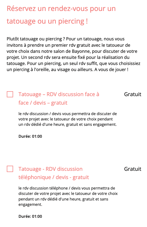 As you can see, this tattoo artist has organized his services into categories, and for each category he has created diversified services based on their duration.
