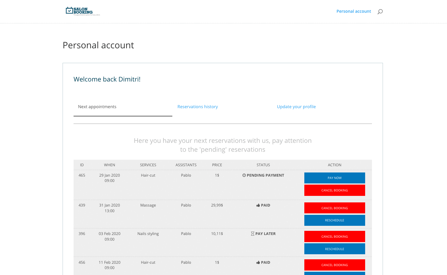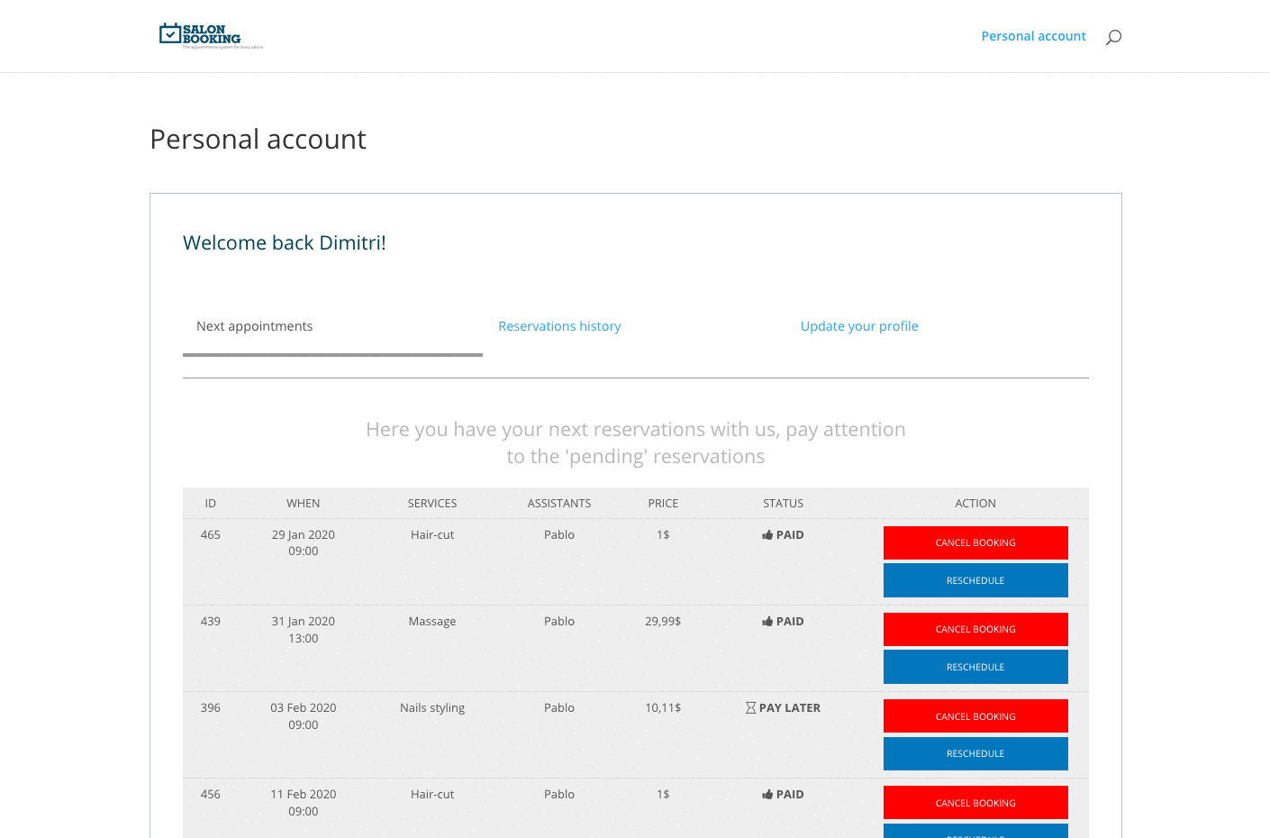 This page called “Booking My Account” is generated by this shortcode [salon_booking_my_account] as soon as the plugin is activated.